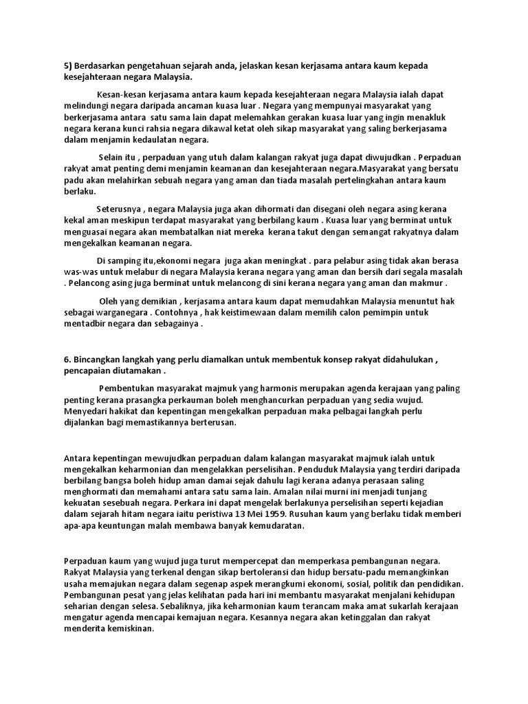 Secara keseluruhan perpaduan kaum merupakan antara faktor terpenting dalam mengekalkan keharmonian masyarakat berbilang kaum dan agama. Kakitangan Majlis Bandaraya Petaling Jaya MBPJ menunjukkan Jalur Gemilang ketika Majlis Pelancaran Kempen Kibar Jalur Gemilang. SPM 2011 Rakyat sanggup berkorban untuk mempertahankan negara daripada penjajahan Rakyat taat setiakepada raja dan negara Memperkukuh keharmonian danperpaduan antara kaum Meningkatkan penguasaan pelbagaikemahiran teknologi Meningkatkan penguasaan pelbagaikemahiran teknologi Menguasai pelbagai bidangilmupengetahuan Pemimpin negara berpandangan.