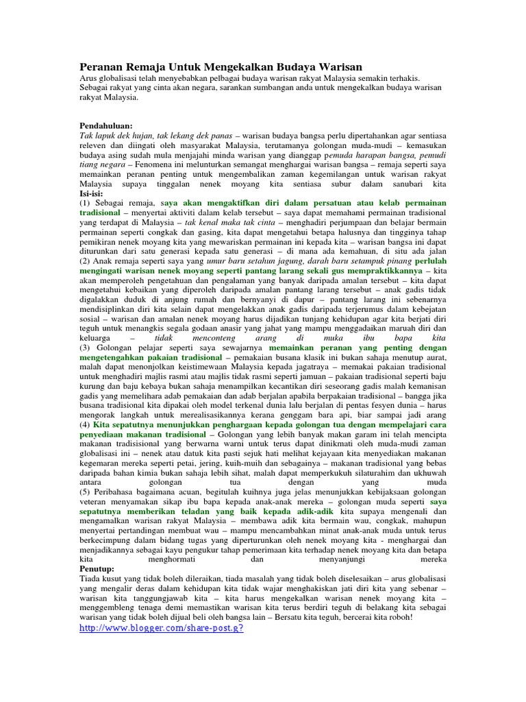 Laman Bahasa Melayu Spm Jerayawara Mengulas Jawapan Soalan 1 Rumusan Peperiksaan Percubaan Negeri Diteruskan Untuk Negeri Pahang. Tak lapuk dek hujan tak lekang dek panas warisan budaya bangsa perlu dipertahankan agar sentiasa releven dan diingati oleh masyarakat Malaysia terutamanya golongan muda-mudi kemasukan budaya asing sudah mula menjajahi minda warisan yang dianggap p emuda harapan bangsa pemudi tiang negara Fenomena ini melunturkan semangat menghargai warisan bangsa remaja seperti saya memainkan peranan penting untuk mengembalikan zaman kegemilangan untuk warisan rakyat Malaysia.