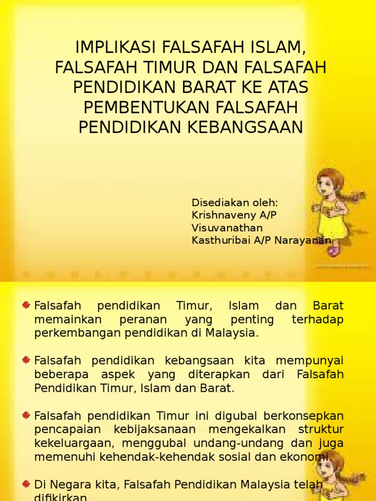 Perubahan bahan-bahan pelajaran yang mengutamakan nilai-nilai murni diserapkan dalam semua mata pelajaran. Implikasi Falsafah Pendidikan Islam Timur dan Barat Terhadap Perkembangan Pendidikan di Malaysia. Falsafah Pendidikan Kebangsaan merupakan sebuah dokumentasi yang murni dan luhur dan memerlukan penghayatan pemahaman dan keprihatinan para pendidik untuk merealisasikan tujuan dan cita yang tersurat dan tersirat dalam kandungannya.