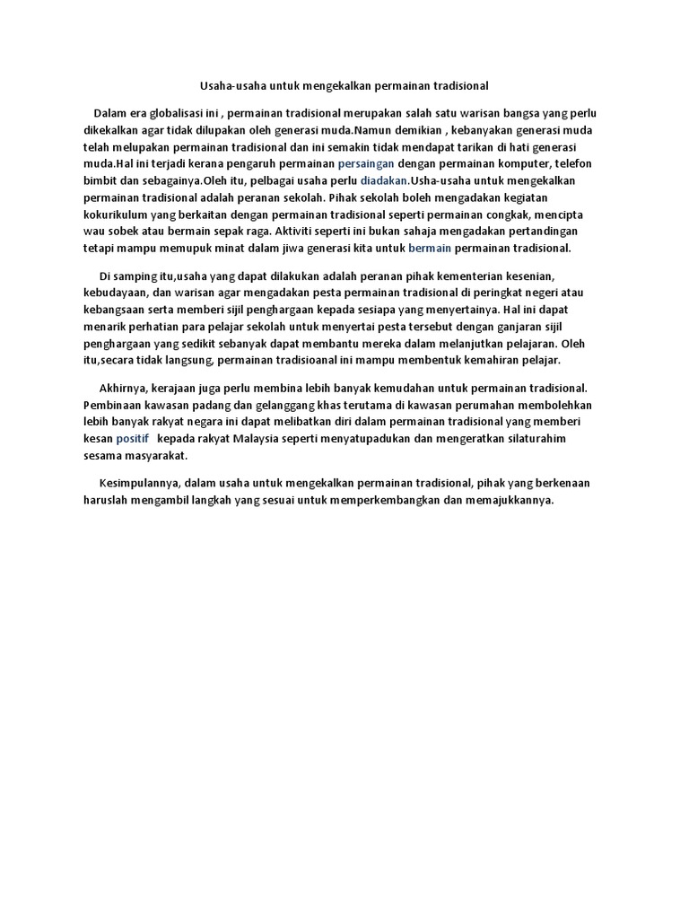 Usaha Bagi Mengekalkan Permainan Tradisional. Permainan tradisional merujuk permainan warisan lama yang diamalkan oleh nenek moyang kita. Usaha Mengekalkan Permainan Tradisional Karangan Spm.